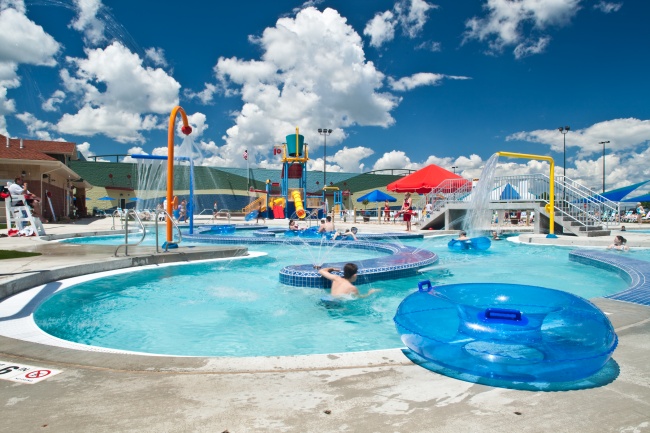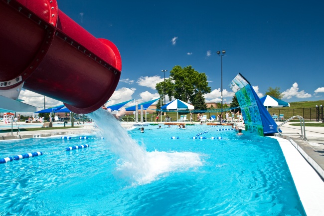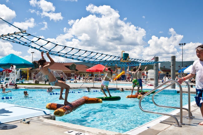 The outdoor aquatic facility includes a lazy river, lap pool, 3 water slides, zero entry (kiddy pool) & splash pad, huge dump bucket, climbing wall, adventure walk, a wheelchair-accessible lap pool, and snack bar.